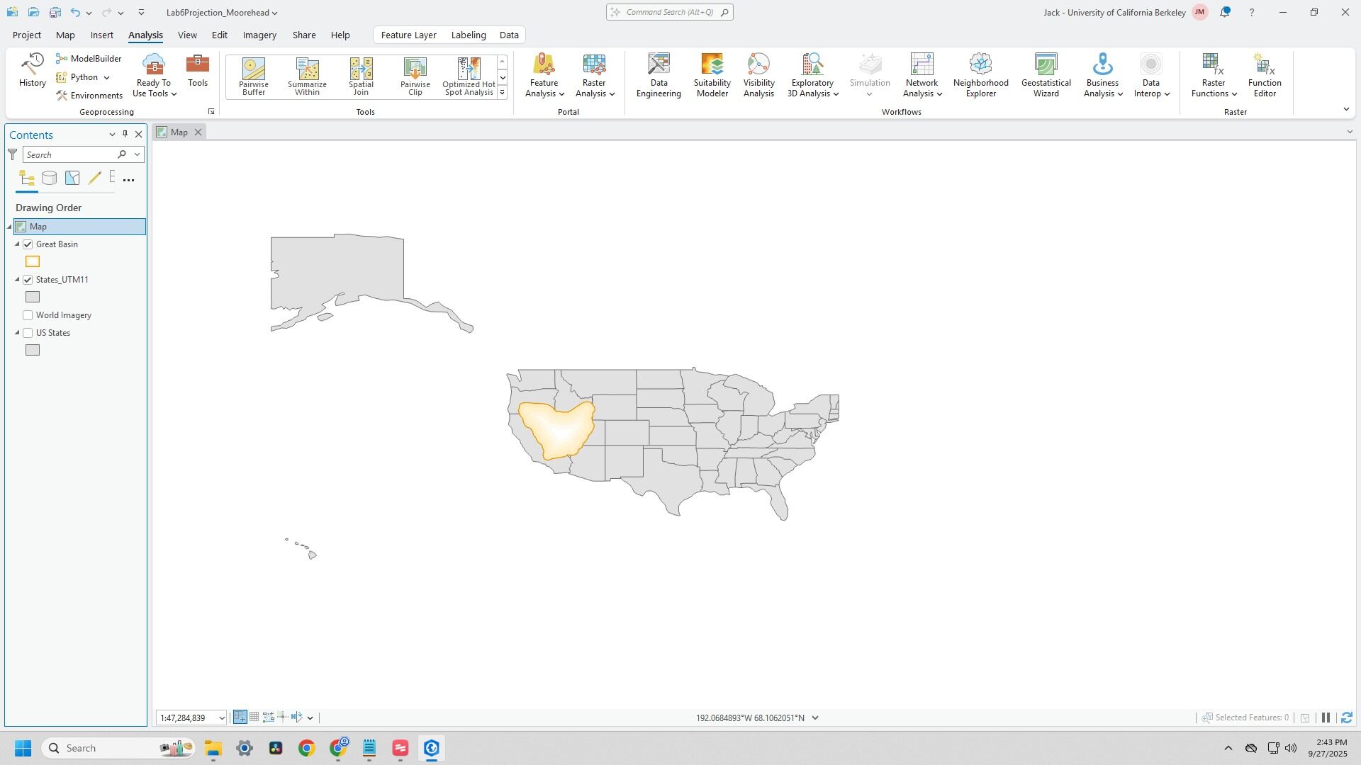 NOTE: renaming the data layer in a GIS interface does not change the name of the file. Never change the name of the file. Yes, its ugly. But recall how the ESRI processing environment is directly talking to your project file path. If anything becomes renamed in the [[Lab6Projection_LastName/GreatBasin/Data/(data type).shp]] folder, your data will disappear.